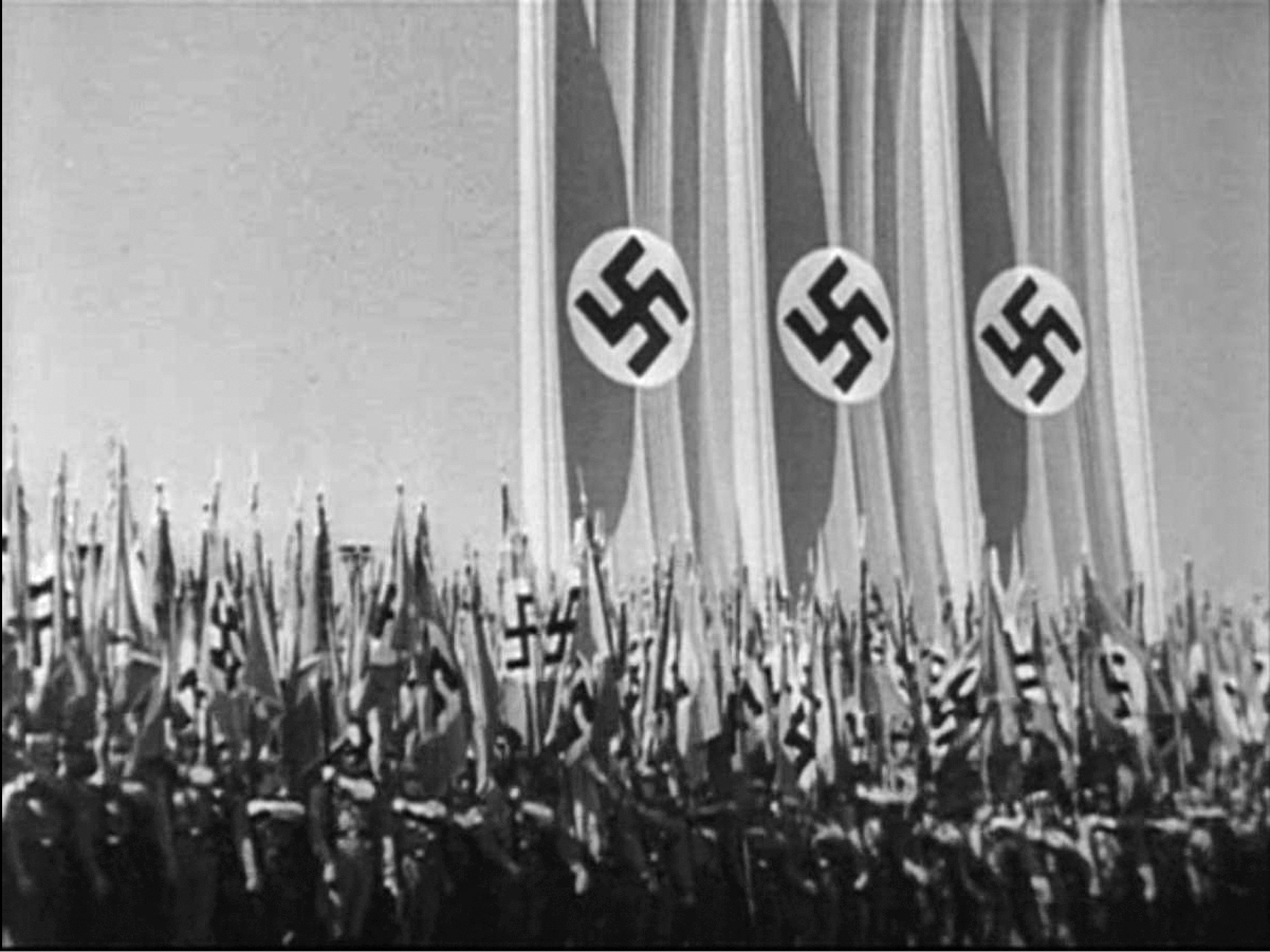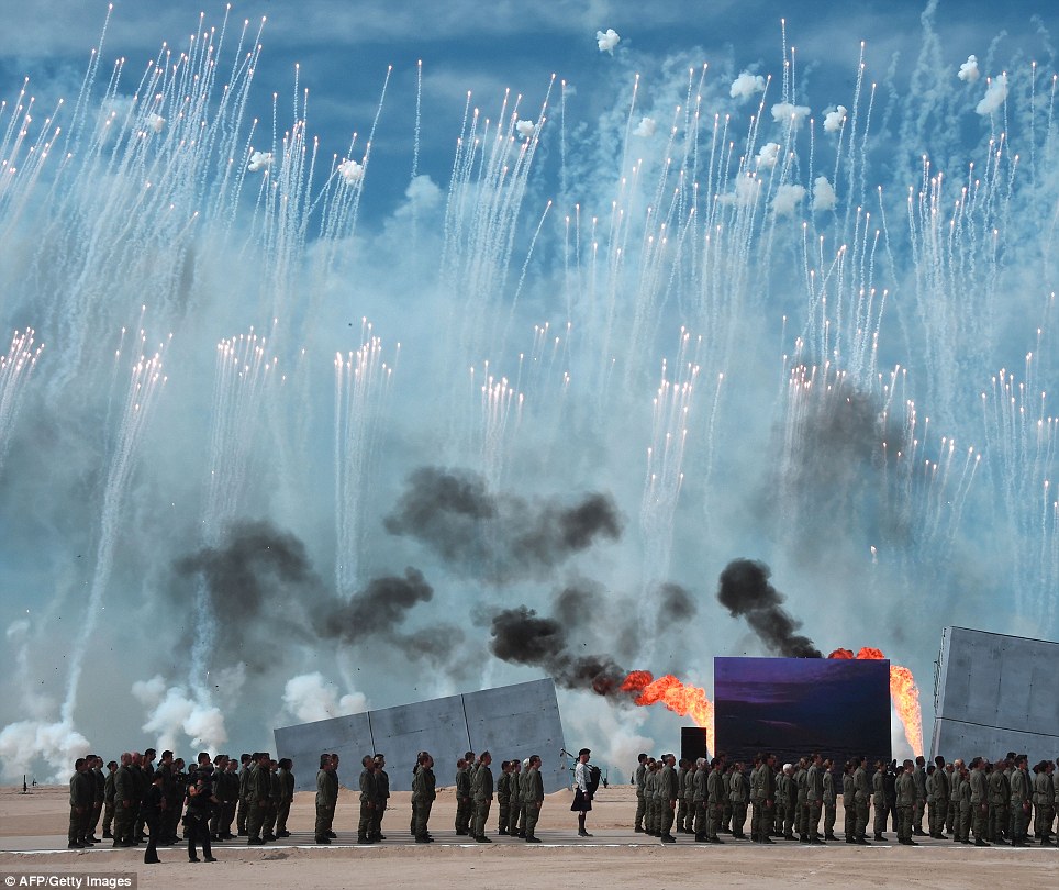 Another slide showed banks of a huge choir with a huge orchestra below, and behind them a cyclorama that screened a tank rolling towards the audience.